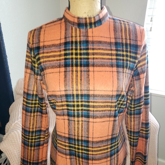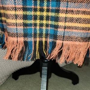 Beautiful plaid dress with fringed sleeves and hem. Orange, blue, yellow and black. It's sized a medium, but it runs small, IMO. For reference, maybe a size 2 or 4..