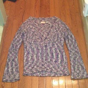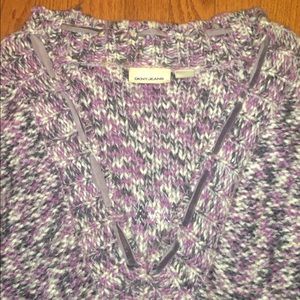 DKNY Jeans Purple Marled Deep V Neck Sweater Sz M. Marled knitted sweater with light gray, dark gray, purple and white colored yarn. Bell sleeves. Fitted silhouette. Deep v neck with velvet ribbon embellishment. Materials: 70% acrylic/ 21% wool/ 9% alpaca. Measurements: Chest Circumference: 36 inches/ Waist Circumference: 36 inches: Sleeve Circumference: 12 inches/ Sleeve Length: 29 inches/ Overall Length (Shoulder to Hem): 27 inches.