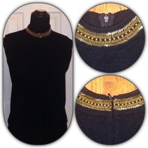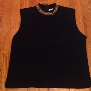 Jones New York Black Embellished Neck Top Sz Small. Can Fit Sz Medium Too. Sleeveless. Back Center Zip At Neckline. Materials: 52% Acrylic/ 48% Lambswool. Measurements: Length: 21 inches. Chest Circumference - 37 inches/ Waist Circumference - 39 inches.