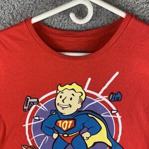 This Fallout Lootwear Exclusive T-shirt features Vault Boy dressed as a superhero with a bold "101" emblem on his chest. The shirt is red with a vibrant graphic design, perfect for fans of the Fallout video game series. It is a men’s size Large and made of soft, comfortable material. The shirt is pre-owned and in very good condition with some wear visible on the print. Please see pictures for details.