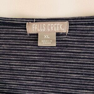 Add a pop of casual style to your wardrobe with this Falls Creek women’s top in a navy and white stripe pattern. This size Large blouse features soft, stretchy fabric, a scoop neckline, and stylish 3/4 bell sleeves with a gathered detail at the elbow.