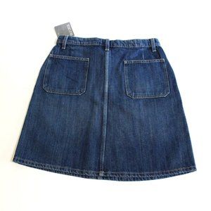 This denim skirt has deep front utility pockets in addition to two back pockets. It has a front zipper with button closure.