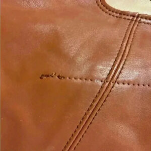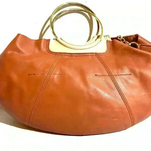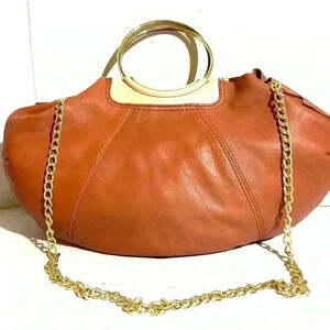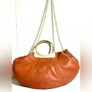 Falor brown leather chain link handle handbag with gold tone hardware rolled handles & chain link shoulder handbag suede lining 2 pockets at interior wall snap closure at top lining have some stains marks exterior have marks scratches cracks creasing back have some loose thread handle strap have some tarnishing hight 11” wide 13” depth 5” strap drop 6” shoulder strap 22”