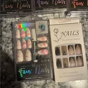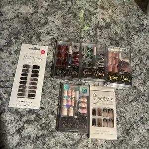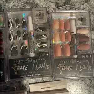 5 false bail packs along with 1 instant manicure nail wraps. 24-piece set with solid black and silver glitter designs. Easy application. Ready-to-wear nail look.