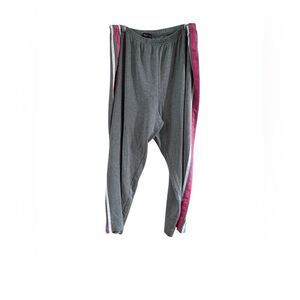 Frame 4 fifteen stretchy gray with pink and white striped pants missing material and size label. It’s 17 inches flat across the elastic Waist 37 inch length there’s a slight stain barely noticeable measures to a 2X and stretching material A107.