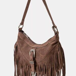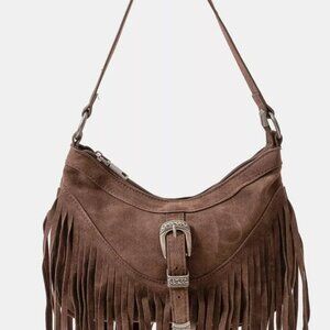 *Add a touch of bohemian flair to your outfit with this Faux Suede Cascade Fringe Shoulder Bag. The faux suede material gives this bag a luxurious and stylish look. The cascade fringe detail adds a fun and playful element to the design. This shoulder bag is perfect for carrying your essentials while making a fashion statement. Pair it with your favorite boho-inspired outfits for a chic and trendy look that will elevate your style.