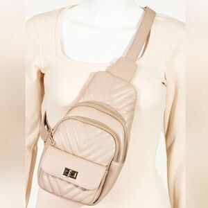 This elegant cream quilted crossbody bag is perfect for any occasion. Its stylish design and nuetral color make it a must-have accessory.
