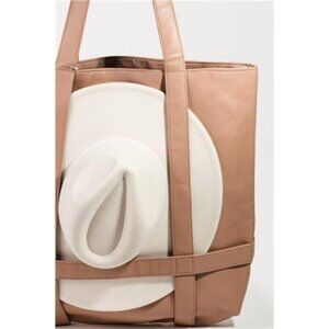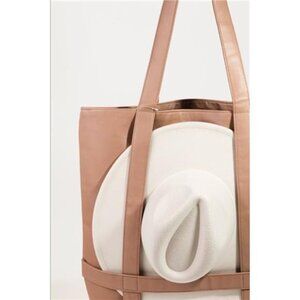 *This innovative leather tote handbag features a unique hat carrier design with specialized compartments to safely transport and store hats while maintaining their shape. Crafted from premium quality leather in an elegant nude tone, this versatile bag combines functionality with style. The spacious interior offers ample storage space for daily essentials while the dedicated hat compartment ensures your headwear stays protected. Features dual sturdy handles for comfortable carrying and durable construction for long-lasting use. Perfect for fashion-forward individuals who need a practical yet stylish solution for transporting hats and personal items.