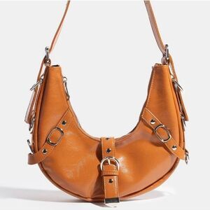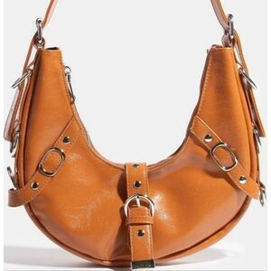 This exquisite crescent moon shoulder bag combines vintage charm with modern functionality. Crafted from premium genuine leather in a rich cognac brown shade, it features distinctive metal buckle hardware and side tassel details that add character. The unique curved silhouette offers both style and practicality, while the adjustable shoulder strap ensures comfortable wear. Perfect for fashion-forward individuals seeking a statement piece that transitions seamlessly from day to evening wear.
