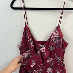 Fame & Partners Floral Ruffle Wrap Dress Size: 6 Color: burgundy/ floral print