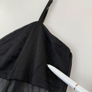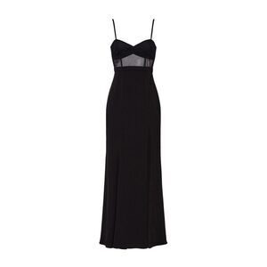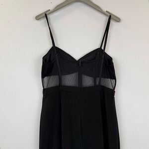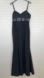 Black crepe (100% Polyester). A-line gone. Sweetheart neckline. Sleeveless. Back zipper closure. 58" from shoulder to hemline. Waist 32”. Pit to pit 18”hip 42”. Slit 29”