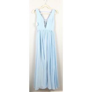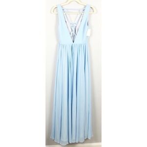 Features plunging v neckline, strappy details, side zip closure, lightweight chiffon, and interior lining. Maxi, long length. Sleeveless. Pastel, light blue. Cocktail, event, formal, evening, bridesmaid, party, prom.