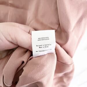 High neck silhouette with lock back. Pleat detailing around the skirt. Adjustable straps. Hidden back zip closure. Lined. Color is more of a peachy light brown.