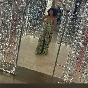 Yellow animal printed crepe (100% Rayon). Jumpsuit. Sleeveless. Square neckline. Hidden center back zipper with hook-and-eye closure. Fully lined. Pockets. Inseam: 29". Rise: 13". Leg Opening: 36". 58" from shoulder to hemline.