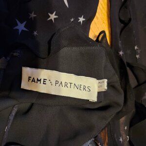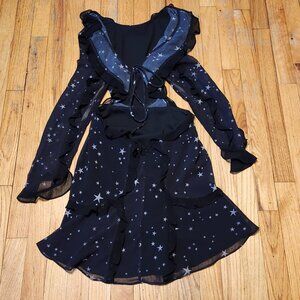 Elegant black dress with star pattern. Features backless design and ruffled details. Perfect for evening wear.