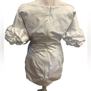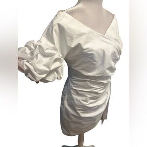 This elegant white wrap dress features stylish ruffled sleeves and a flattering silhouette. Perfect for any occasion, it offers both comfort and style.