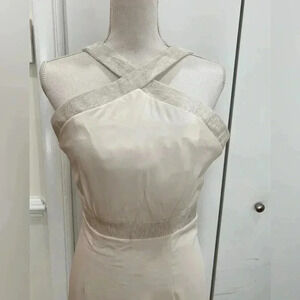 Has crossover style at back and a great quality dress. Very nice for special occasions.