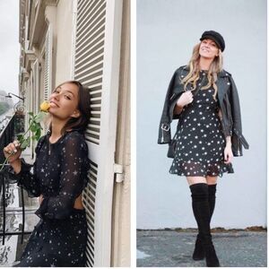Romantic and whimsical, this Fame and Partners “Kye” Night Sky star print mini dress features a playful ruffled hem, flirty cutout open back, sheer long sleeves, and a flattering tie waist. Perfect for wedding guests, date night, holiday parties, birthdays, or vacation nights out. The black chiffon with white star print adds a dreamy, celestial vibe.