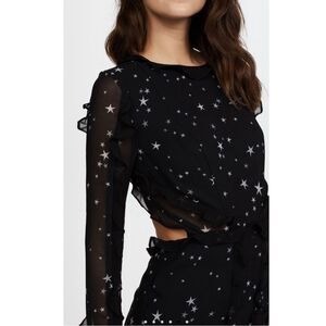 Fame and Partners Kye dress, night sky star mini, black ruffle cutout dress, celestial print party dress, bohemian chic evening outfit, wedding guest cocktail dress, romantic long sleeve mini, feminine holiday vacation dress, New Years Eve starry dress