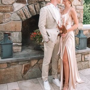 Matte Champagne Satin Gown, with thin straps and a tasteful side slit. Perfect for bridesmaid or bridal look. Worn once (to my small backyard wedding). Was super comfy and looked great in pictures! Size 8.