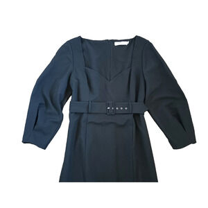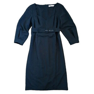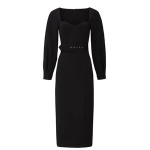 Fame and Partners The Maiden Dress in black, size 18. Sweetheart neckline, belted waist. Hidden back zip. Poly spandex blend with excellent drape. In gently preowned condition, no flaws noted.