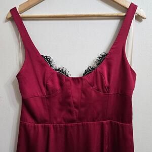 Fame and Partners, red satin dress, lace maxi dress, evening gown, formal wear, women's sleeveless gown, satin evening dress, size US 8 dress, Australian design dress, elegant satin gown.