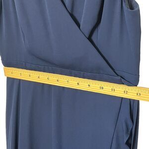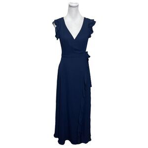 This Fame and Partners A-line wrap dress features a true wrap design with short ruffled sleeves and cascading ruffle trim. Crafted in a rich navy blue with a flattering V-neckline, it's fully lined for comfort and elegance—perfect for weddings, dinners, or dressy daytime events.