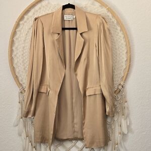 Free People X Fame and Partners Women's Tan Satin Longline Oversized Open Blazer. Free People x Fame Oversized Jacket.