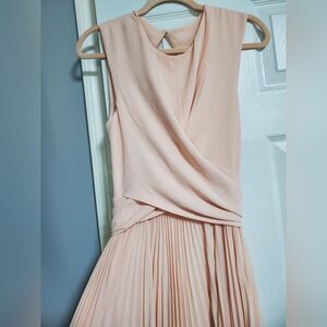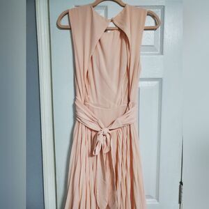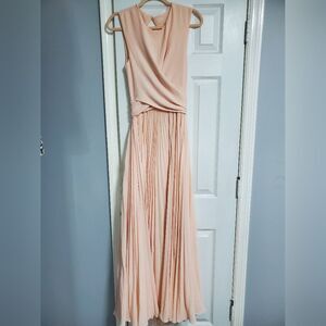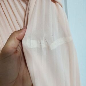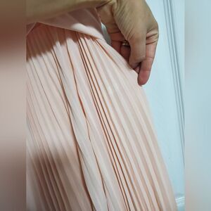size 8..beautiful peach color. p2p is 20" and length is 60". has a flaw looks like been mended poorly. i would say put one stitch on the side of skirt and it will hide the flaw completely.