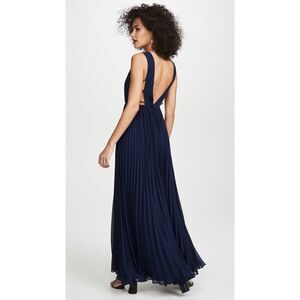 A deep front slit, plunging neckline, and rich accordion-pleated texture ensure that this Fame and Partners dress will always be a stunning choice for a formal occasion. Strappy details accent the sides of the bodice.