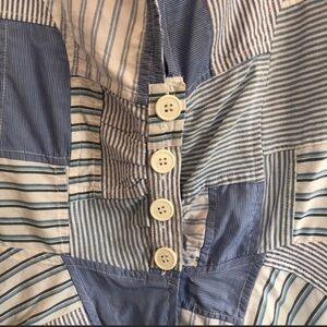 The patchwork fabric of this intricate jacket is made up of striped cotton squares. It can be worn as a summer jacket or as a shirt. It features four front buttons to close, a flare bottom opening, long sleeves with buttons at the cuff, and a rounded neckline which can be folded down to form a front pointed collar. In excellent condition. *Tagged For Love and Lemons for exposure