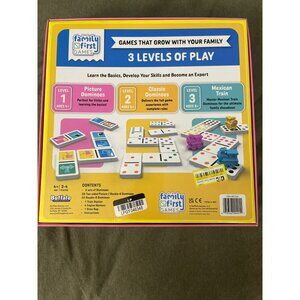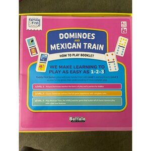 It includes three levels of play: Level 1 is Picture Dominoes, Level 2 is Classic Dominoes, and Level 3 is Mexican Train.