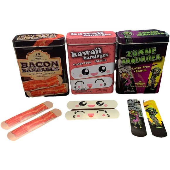 A collection of fun bandages for the whole family. Bacon, Kawaii, and Zombie. 1 Tin of 15 of each style for a total of 45 bandages. Latex free, sterile. Measures 3" x .75" Items are new. Tins may show some light wear.