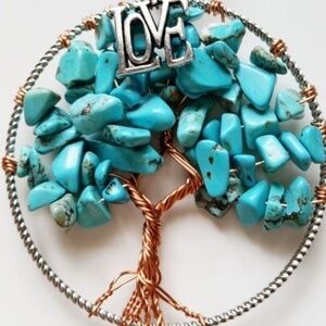 Crystals, blue & white beads with tree pendant with love charm. It will sparkle in your car, truck or window! It hangs between 6 & 8 inches and has a metal clasp, so it will stay secure on your rear view mirror. One of a kind and very unique! Your charm will come in a satin jewelry bag for perfect gift giving! You can use the jewelry bag as a cell phone holder or anything else!