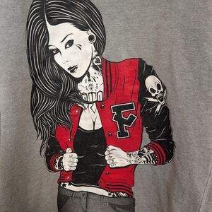 This Fatal sweater showcases a classic crew neck design in a versatile gray shade, highlighted by vibrant red accents. The front features bold graphic prints, adding a touch of modern style to its timeless appeal. Perfect for casual wear, this sweater offers both comfort and a distinctive look.