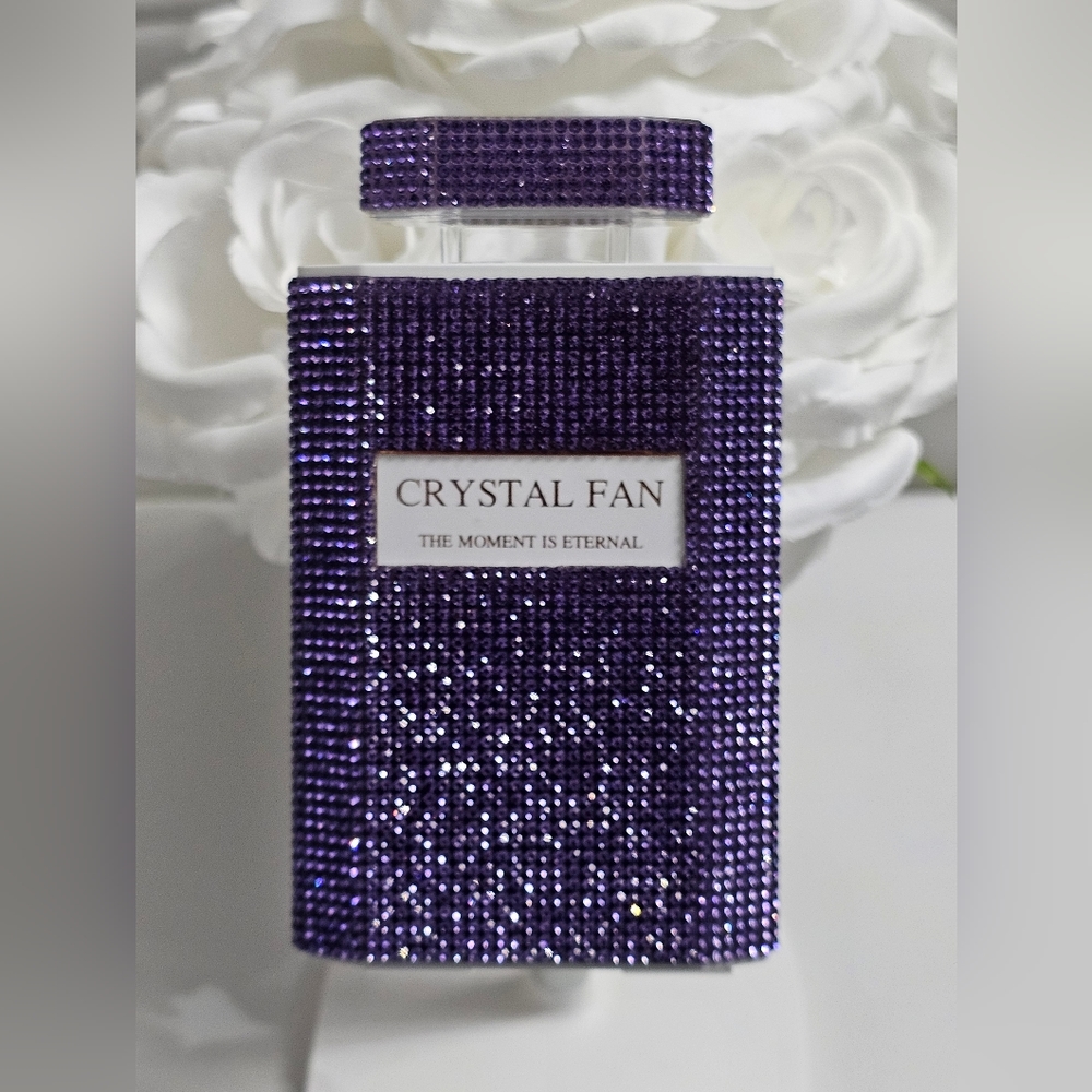 Handheld Rhinestone Purple Fan. Blinged fan has 3 settings and comes with a usb cord for charging.