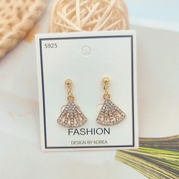 Fan Shaped Dangling Earrings in Gold with Rhinestones