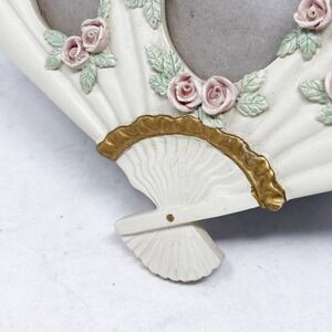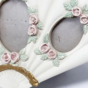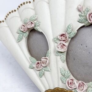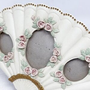Fan Shaped Photo Frame Cottagecore Picture Holder Roses Cream Gold Trim Vintage