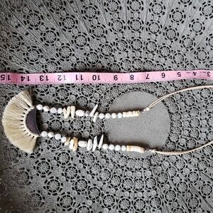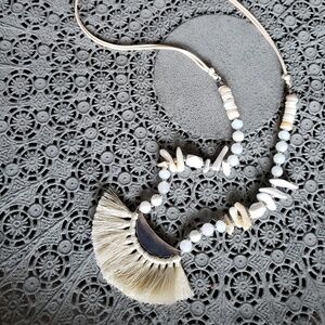 Fun fan shaped tassel necklace with silver tones metal. Cream, ivory and white toned stones and beads and a leatherette cord. Very bohemian. Hangs 15 inches long plus an extender chain for adjustable lengths.