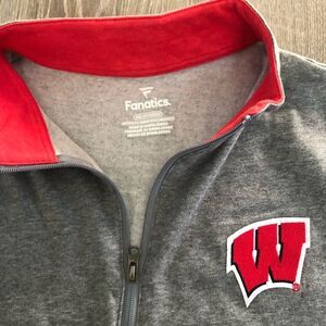 Mens Fanatics University of Wisconsin Badgers NCAA 1/4 Zip Gray Pullover Long Sleeve Sweatshirt. Size XXL 2XL. Pit-to-pit 26", Collar-to-Hem 30.5". No rips, tears or stains. See photos for condition.