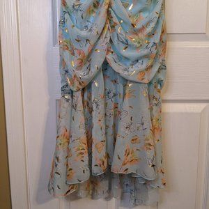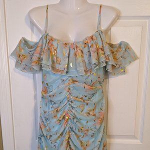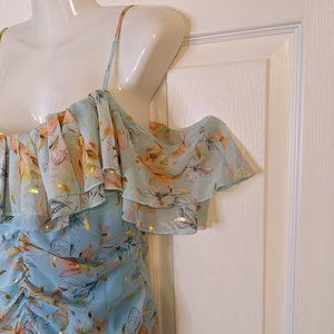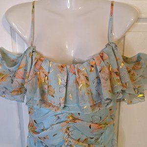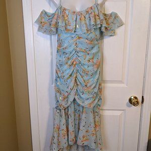 Fanco Baby Blue Floral Cold Shoulder Ruffle Ruched Hi Lo Long Midi Dress - M