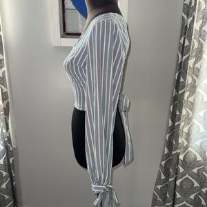 Super cute long sleeve striped open back wrap top. Size small. In excellent pre loved condition. Measures 18” across the chest & sleeves are 25” long.