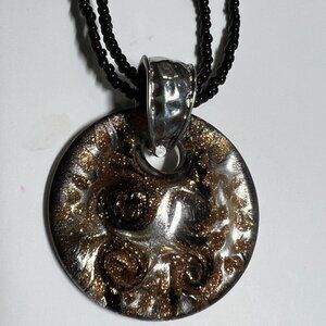 Solid Pendant is attached with nice silver attachment and measures 2" in diameter. Pendant contains swirling colors of glittery gold, black and silver. Very nice for work.