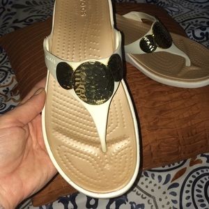 Cream and gold! Dual comfort style thong sandals worn by me a couple of times, excellent condition