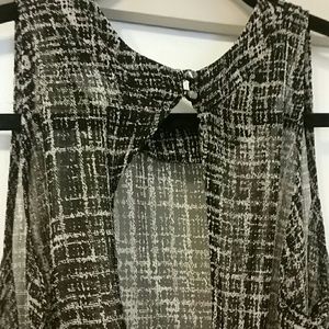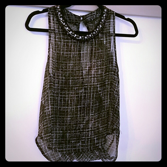 Black,white, fancy, flowy top... With beautiful gems on the top... Open back with 2 buttons on top...