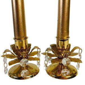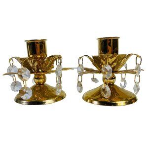 Vintage Fancy Hollywood Gold Tone Candlestick Holder Set Chandelier Australian Glass Crystal Dangling Prisms Romatic