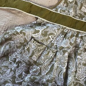 Super Stylish halter apron with a green and white paisley pattern. Very dressy!!! You’ll be the hostess with the mostest in this accessory 👩🍳 Has 1 front pocket. Has a hole on 1 inner tie (pictured), and a few tiny wear & tear holes (pictured)- but you can’t see them & it absolutely does not take away from the entire look!!!