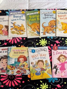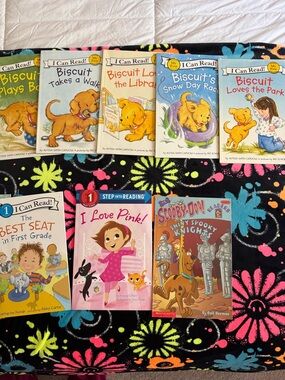 A curated assortment of kids' picture books featuring bright, colorful covers. Includes multiple titles from the popular "Biscuit" series and other early-reader favorites. Vibrant pink, blue, yellow and orange cover art makes reading time engaging. Easy-to-grip sizes and familiar characters encourage early literacy and imaginative play.
