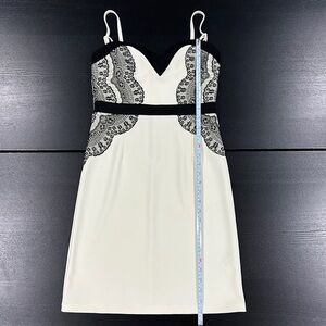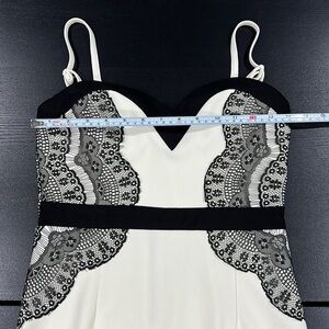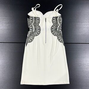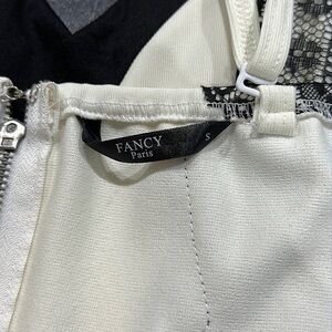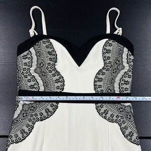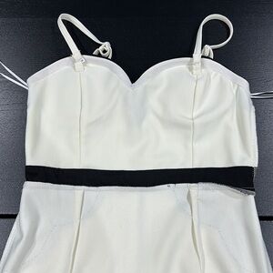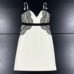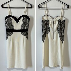 Fancy Paris White and Black Lace Detail Strapless Dress in size Small. No visible flaws or signs of use. Dress has never been used. Lightly padded bra. Removable, adjustable spaghetti straps. Material has a good amount of stretch.