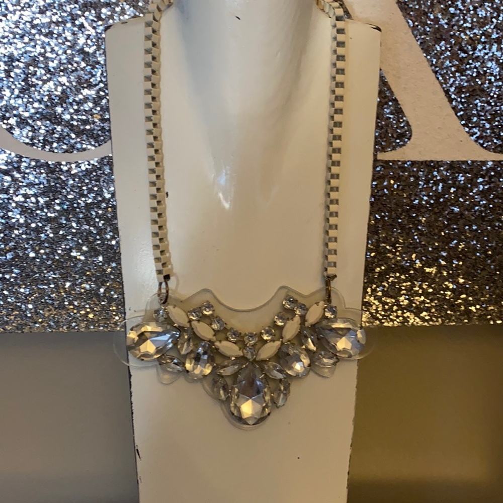 Fancy cream and silver rhinestone necklace. Never worn. I used it for decoration on my Manikin. The cream chain is a metal and it can be adjusted. I attached a photo of the length. If you are interested I can send more photos. Xo